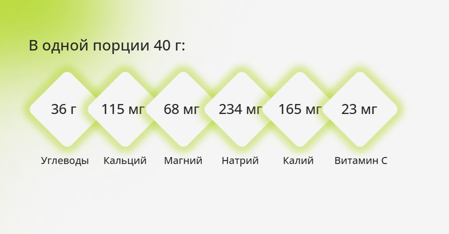 Количество питательных веществ в 40 г продукта и 500 мл напитка: