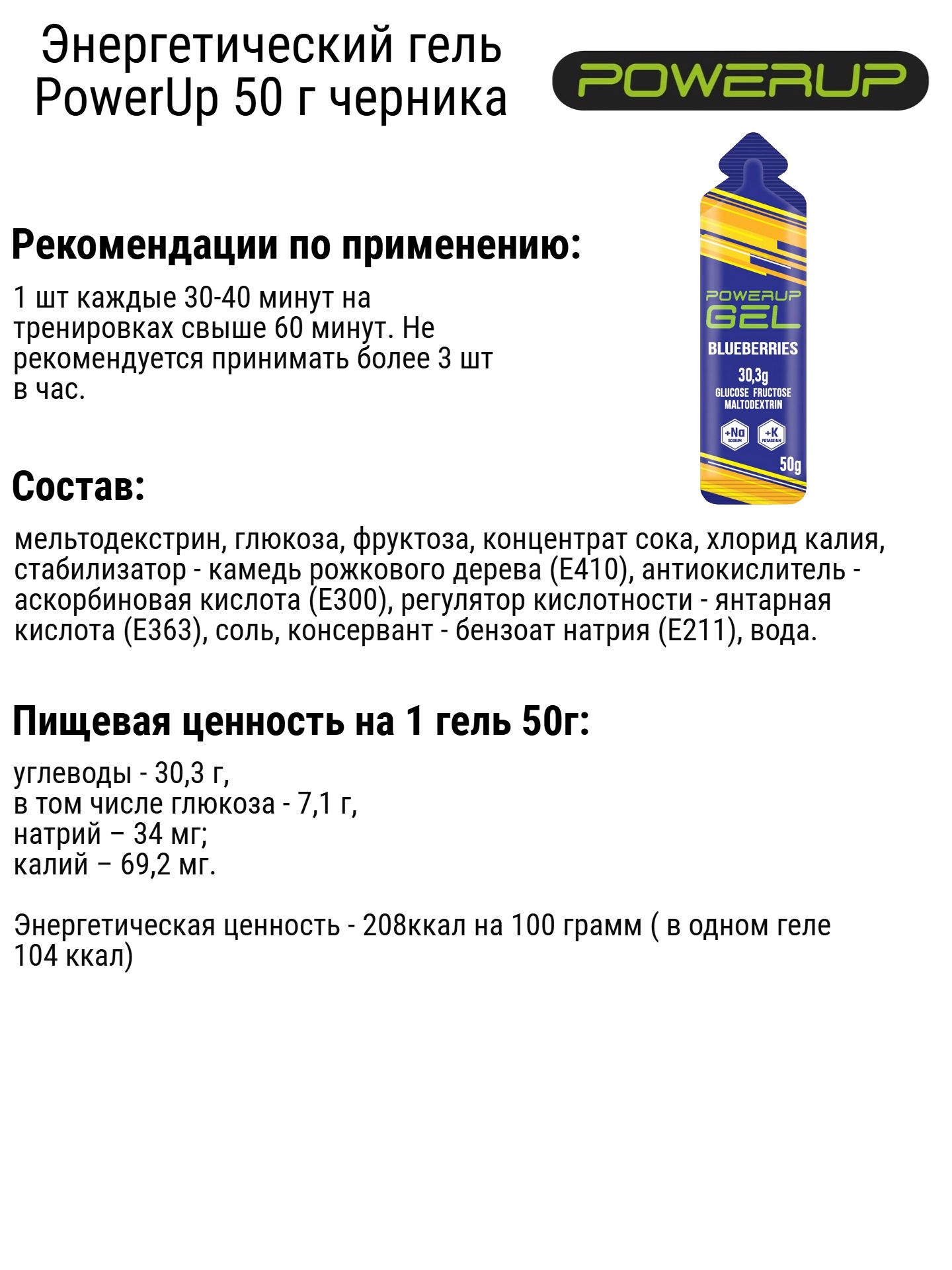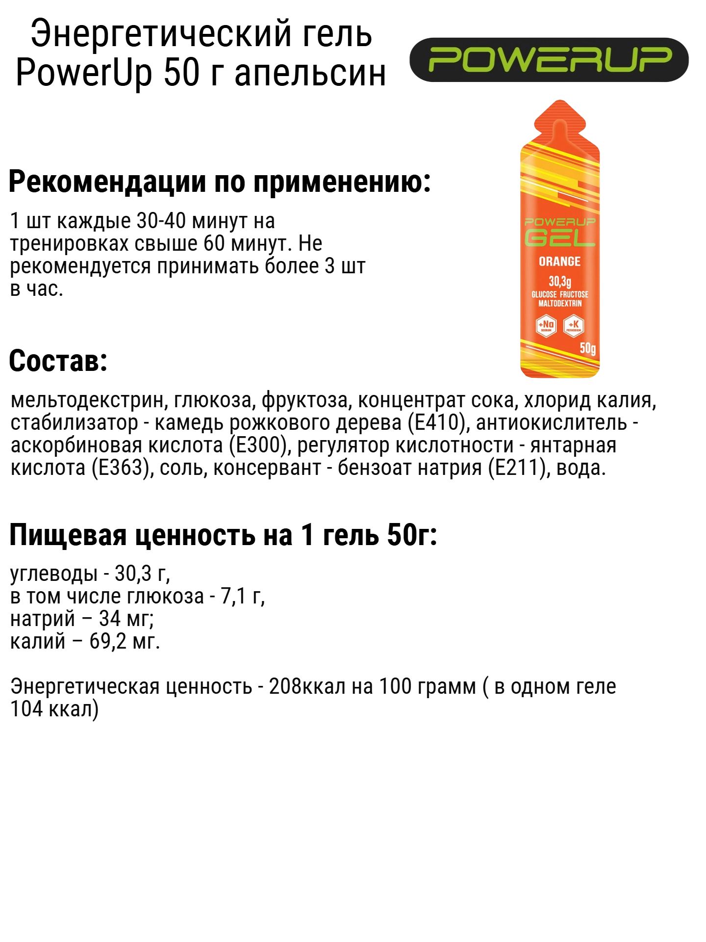 Специальный пищевой продукт энергетический гель с Na и K для спортсменов после приема имеет максимально длительный эффект обеспечения дополнительной энергией на тренировках и соревнованиях - благодаря 104 ккал и 30,3 граммам углеводов, работающих в разное время. Натрий нужен для регуляции жидкостного обмена в организме, потому что именно натрий наше тело теряет в процессе потоотделения. Калий необходим для повышения выносливости.