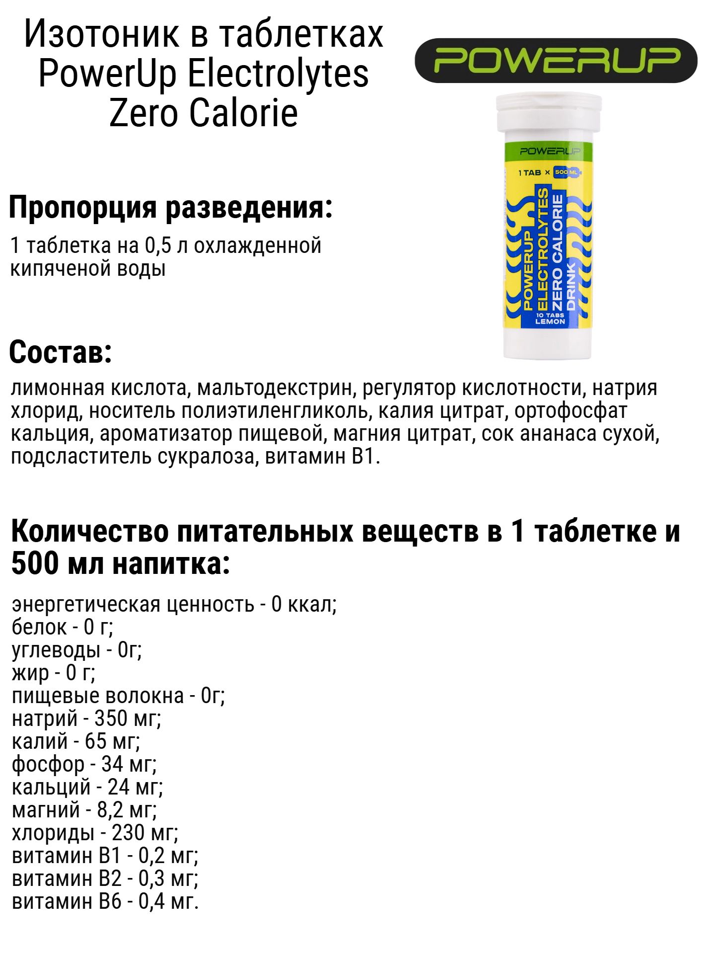 PowerUp Electrolytes Zero Calorie набор необходимых электролитов в форме растворимых таблеток. Изотонический напиток без углеводов помогает возместить потерю важных электролитов во время интенсивных тренировок или нагрузок в жару. Изотоник обеспечивает организм энергией, восстанавливает водно-солевой баланс, повышает выносливость во время длительных тренировок и соревнований, предотвращает возникновение мышечных судорог и укрепляет иммунитет.
