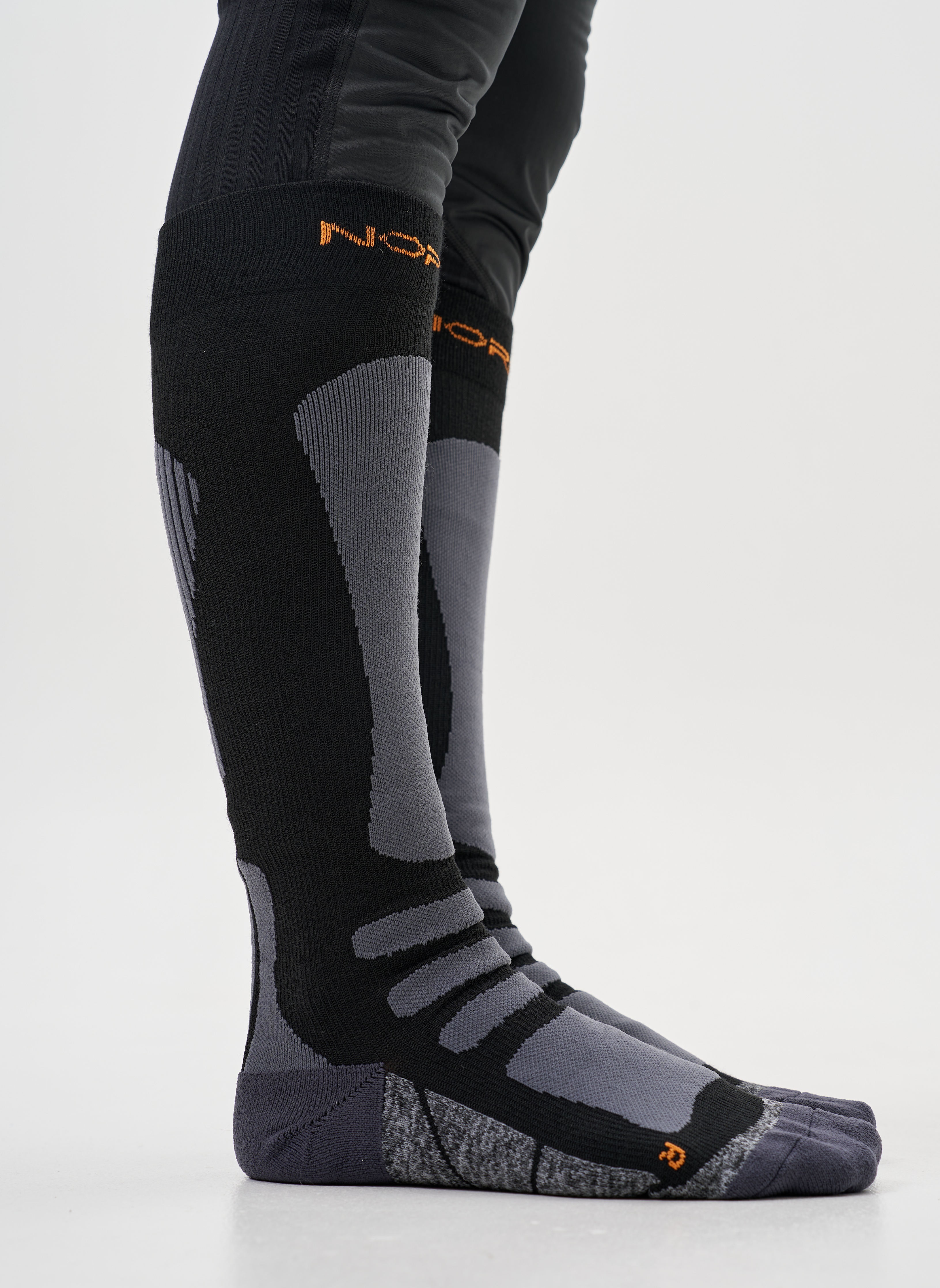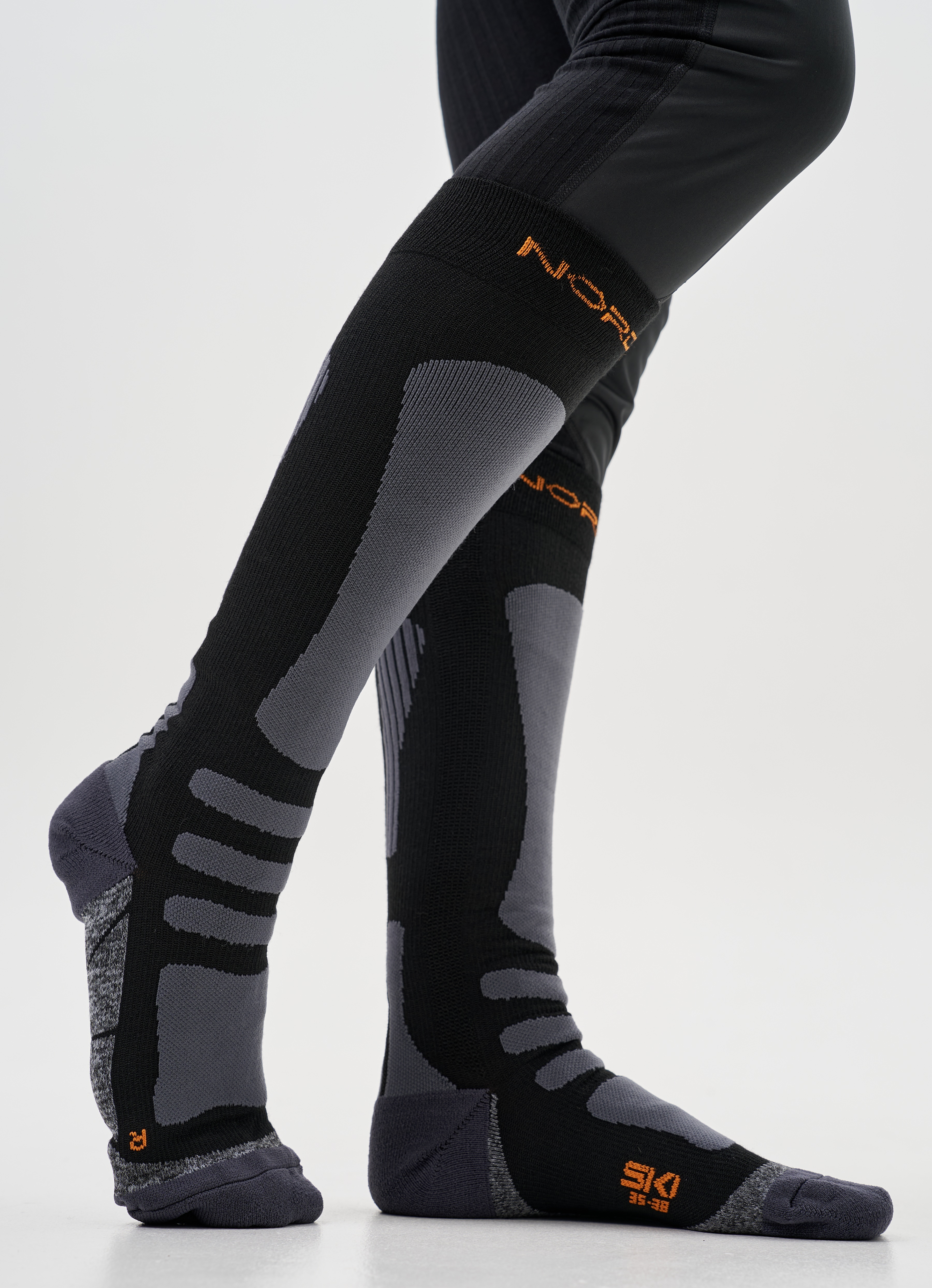 Термоноски плотно облегают стопу, не сдавливая ее, благодаря анатомическому крою . Такая конструкция предотвращает скольжение по ноге даже при длительных пробежках или других видах активности на свежем воздухе. Специальная структура ткани обеспечивает эффективную вентиляцию - ноги остаются сухими даже при интенсивных физических нагрузках. Усиленная носовая часть гарантируют долговечность изделия, снижая риск дискомфорта при длительном использовании. Носки имеют специальные вставки в области икроножных мышц. Это уменьшает давление на икроножные мышцы и не сковывает движения. Длина до уровня колена.