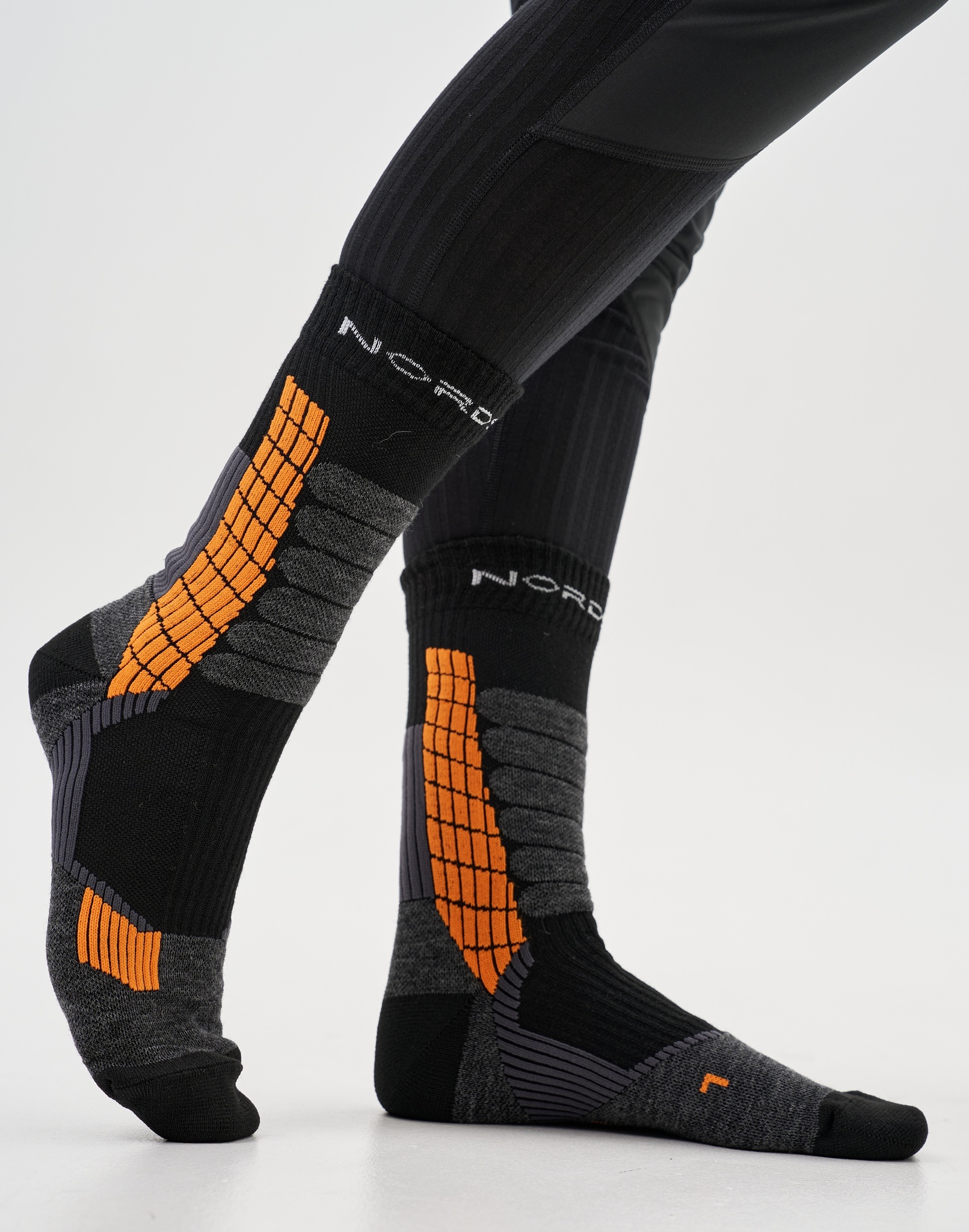 Nordski Trek - спортивные термоноски с уплотненными областями носков и пятки. Рассчитаны на межсезонье и зиму. Специальная технология плетения позволяет быстро выводить излишки влаги наружу, оставляя кожу стоп сухими. Однобортная резинка уменьшает давление на икроножные мышцы, плотно обхватывая голень, не позволяя носку скатываться. Специальное плетение в области голеностопных суставов снижает давление на них во время нагрузок. Полиамид в составе предотвращает возникновение мозолей и натоптышей, а также существенно повышает показатели износоустойчивости носков.