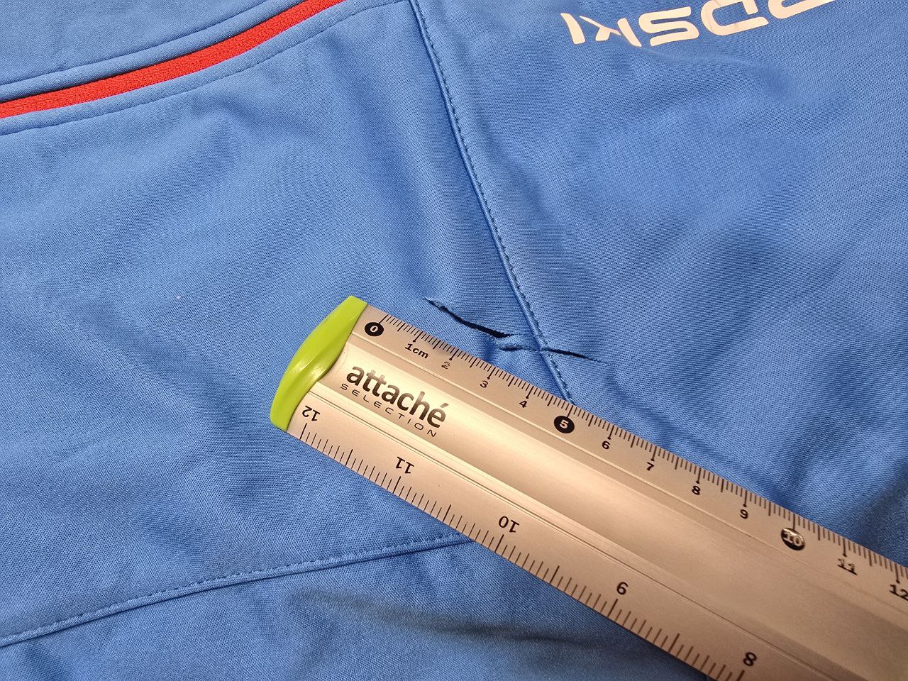 Уценённый товар. На передней части куртки имеется порез 5 см. Сзади куртки два небольших отверстия (менее 1 см) от пореза (см. фото)