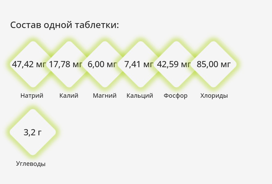 Состав: декстроза, стабилизатор полиэтиленгликоль, натрия хлорид, ортофосфат кальция однозамещенный, калия хлорид, ароматизатор апельсин, магния оксид.